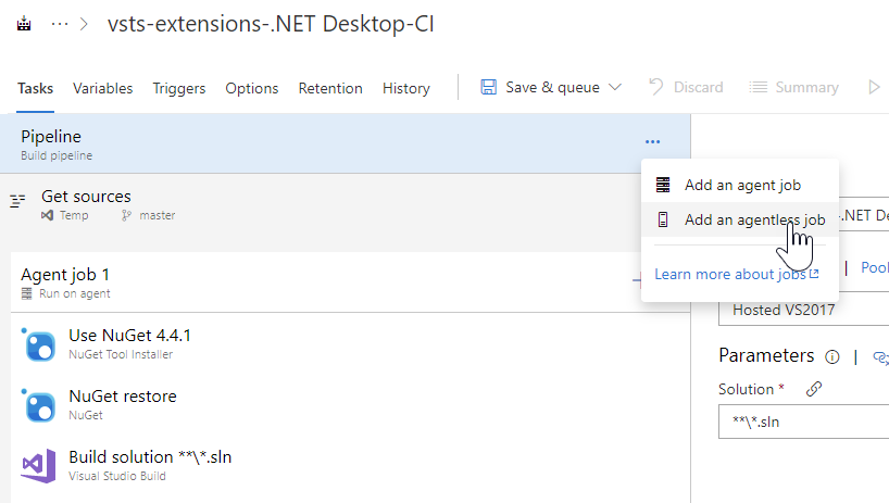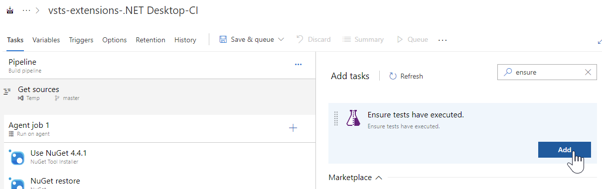 You can find the Ensure Tests task in the Visual Studio Marketplace, once you have them installed you can add them to your build pipeline. To do so you first have to add an "Agentless job":