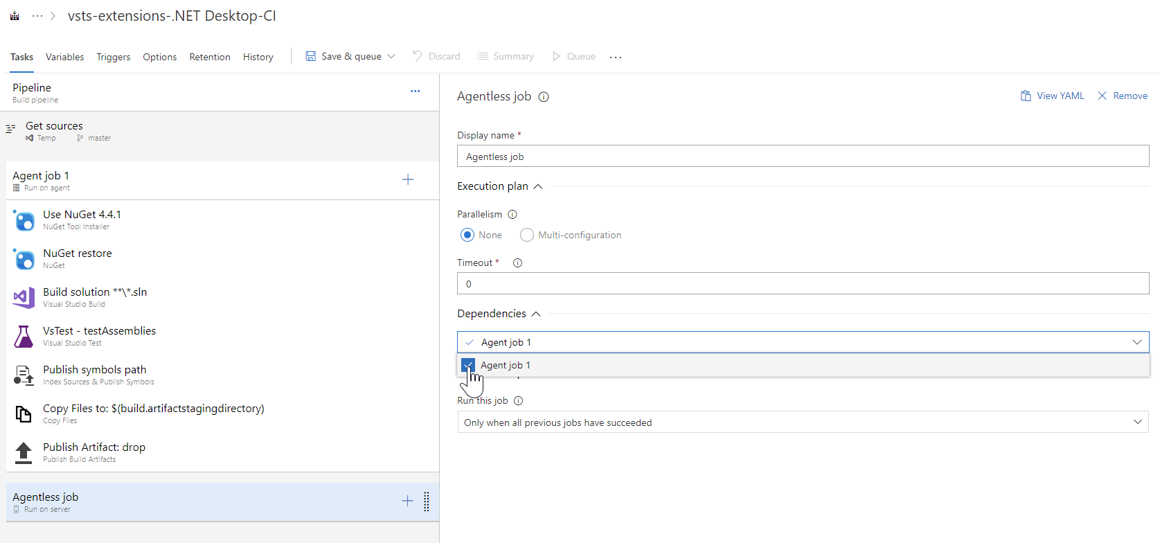 Add the "Ensure Tests" tasks to your Agentless job and you're all set!