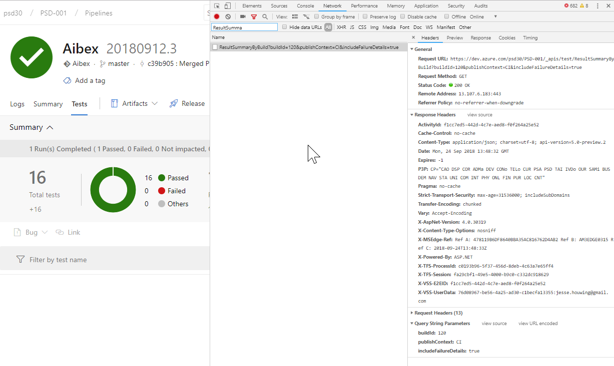 The task queries the test result API and uses the same endpoint that's used by the Build Result page. I used the Chrome Developer Tools to look up the endpoint used by the build summary page to display the Total Tests number:
