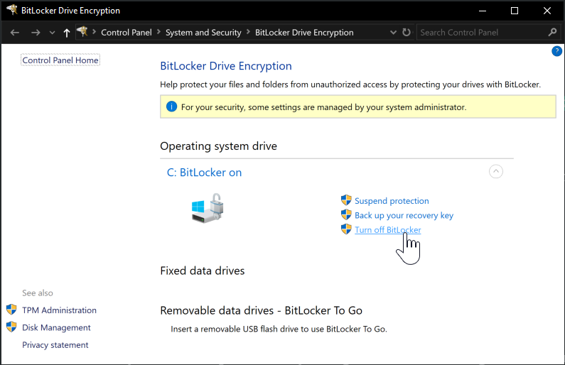 - Make sure you have a backup of your BitLocker Recovery Key. In my case it's uploaded to Azure Active Directory and stored in 1Password.