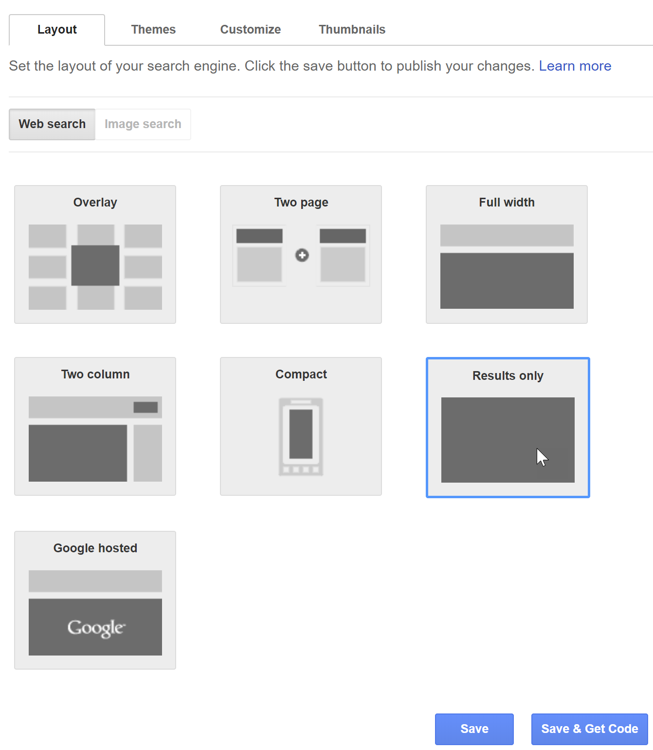 Pick the "Results only" option, that's what we'll be embedding in the Search page later: