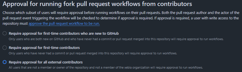 - Require Approval for running fork pull request workflows from contributors