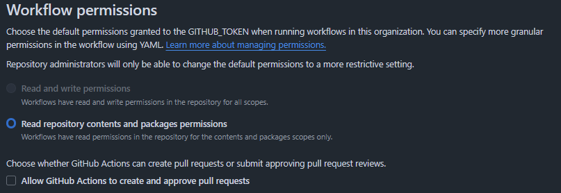 While you're at it, you should also turn off Allow GitHub Actions to create and approve pull requests. Allowing this setting offers attackers a way to bypass branch rulesets under certain conditions.