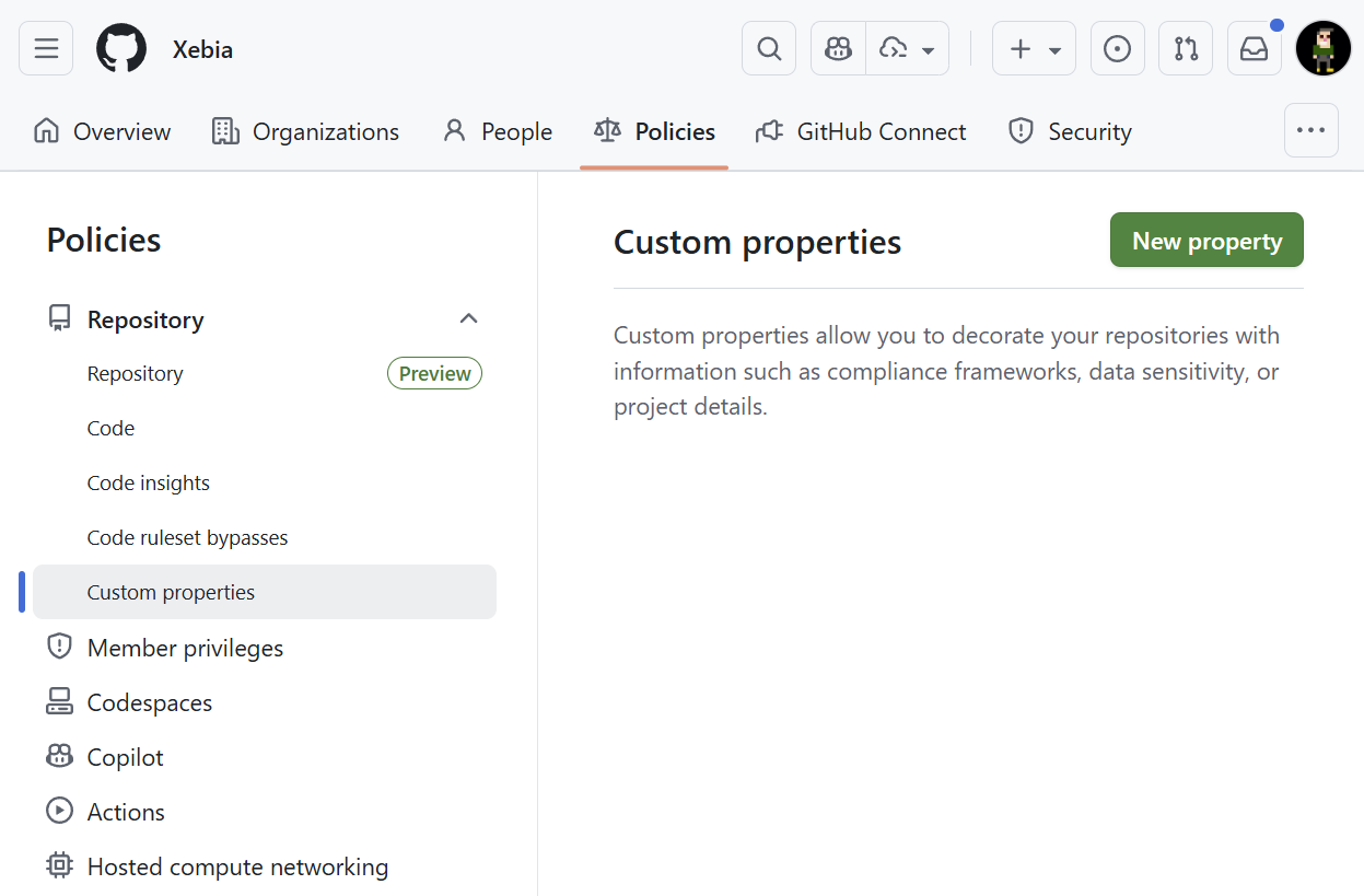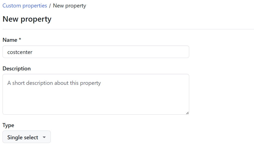 Since our cost centers are defined at the Enterprise level, I chose to create this custom property at the same level. To add a new custom property navigate to your enterprise, select the Policies tab and then drill down into Repository and then Custom Properties. Choose New Property to create your new property: