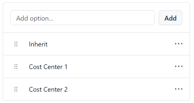 Next, add the list of cost centers you want people to be able to select from as options. I've also included an option inherit which I'll explain later: