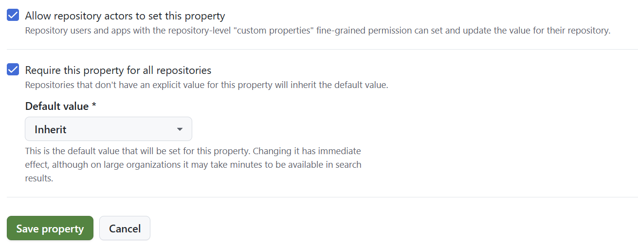 And existing repositories will now show the custom property in the repository settings: