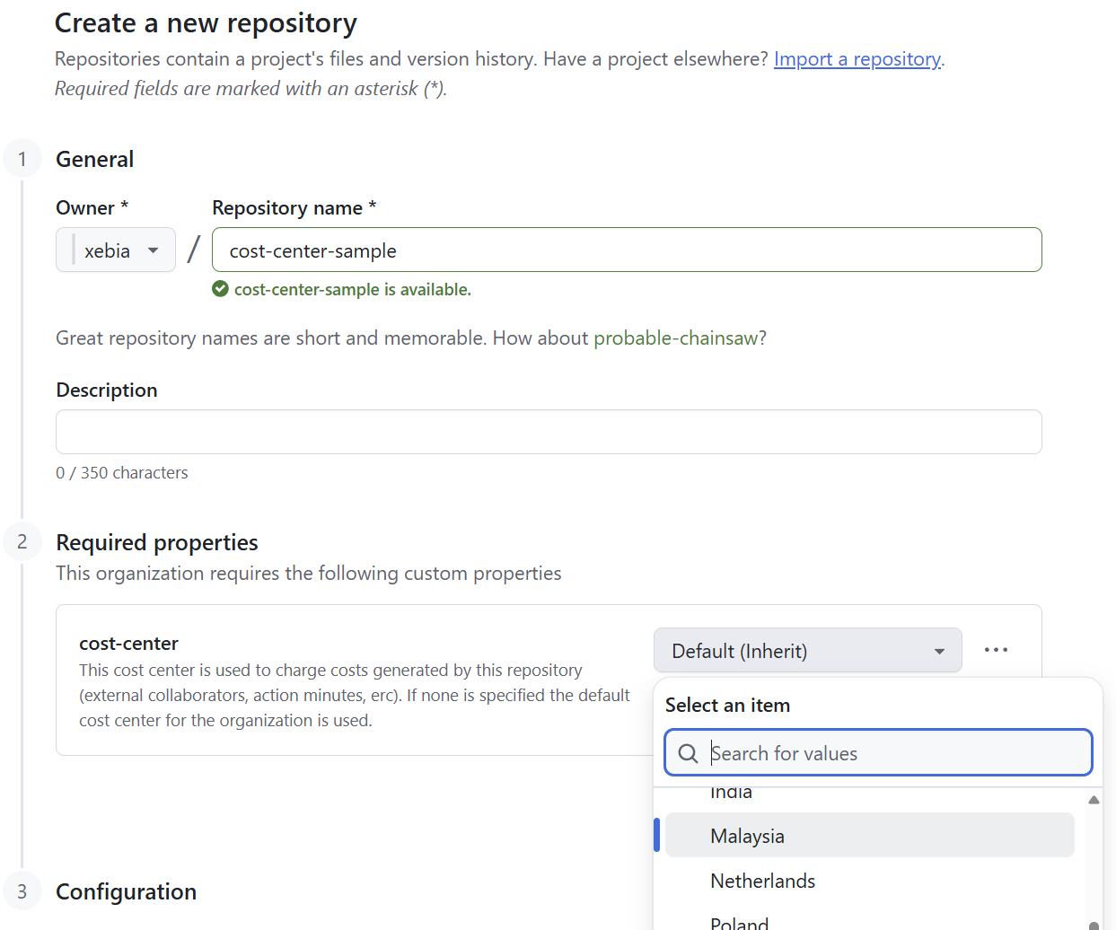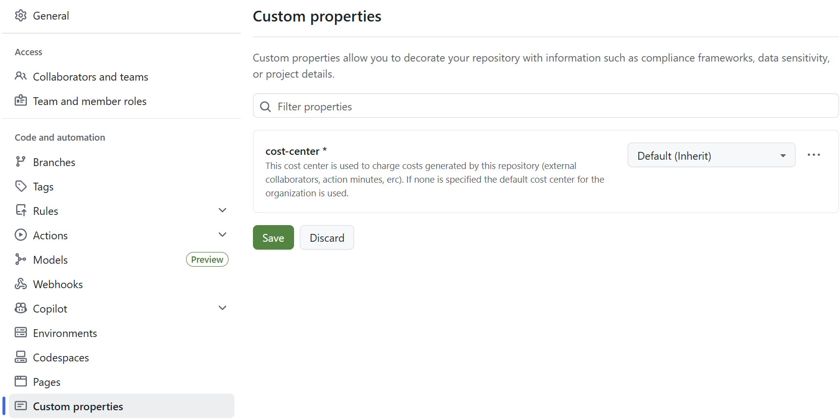 Now when you create a new repository or navigate to the settings of an existing repository, you can set the cost-center custom field: