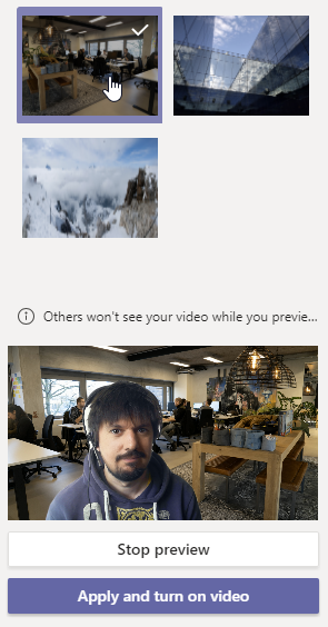 With a lot of people working from home now, we're giving the world a peek into our homes. It may not always be the most representative. You may not have a dedicated room (like me) and sit at the kitchen table. The option to inject a picture of your office or your favorite spot in the mountains is super useful.