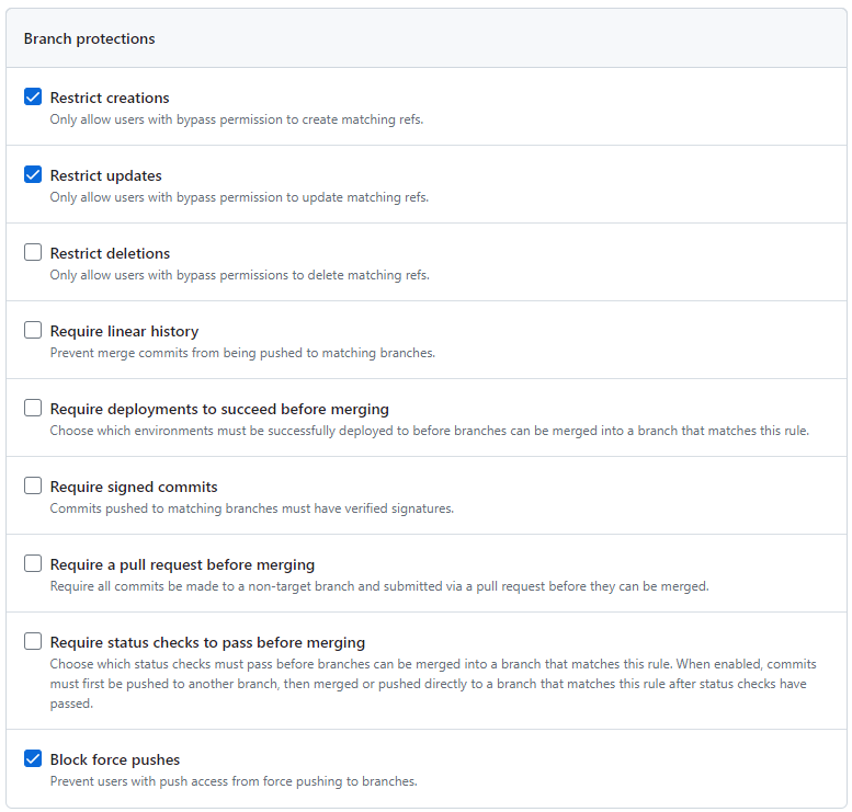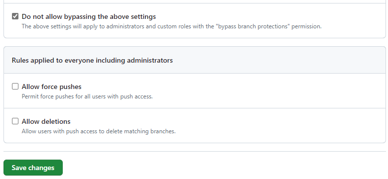 If you have more than one maintainer, you block everyone from bypassing these rules. If you're a lone maintainer like me, you'll have to allow yourself to bypass this protection.