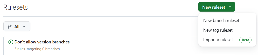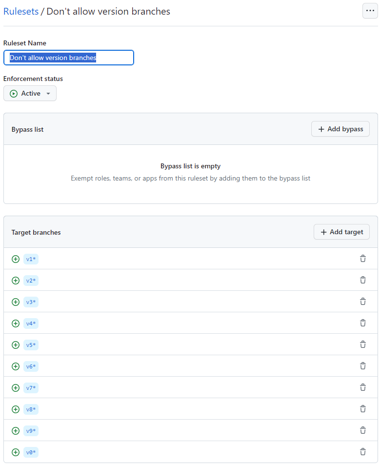 Unfortunately, the branch format doesn't support regular expressions. To not block the creation of a branch calledverify-sanityor any other branch name that starts with av, I've added the protections for all the ways a version tag can be named in GitHub Actions.