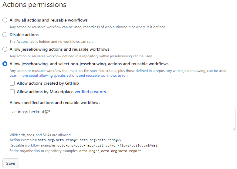 Limit the actions the repo is permitted to run to the exact list of actions used by your repository: