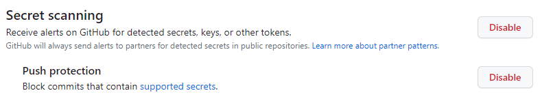 Enable Secret Scanning and push protection: