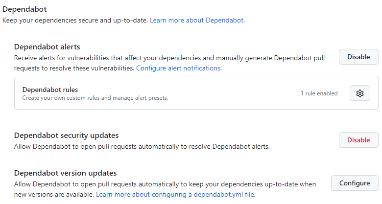 Enable Dependabot Alerts and Version Updates: