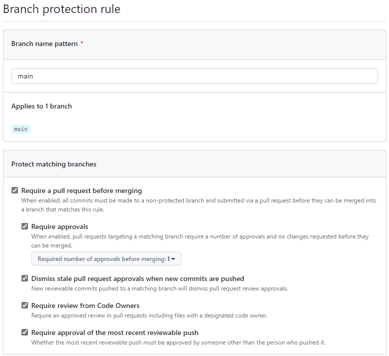Also be sure to setup a Branch Protection for your main branch. Personally, I've setup the following rules: