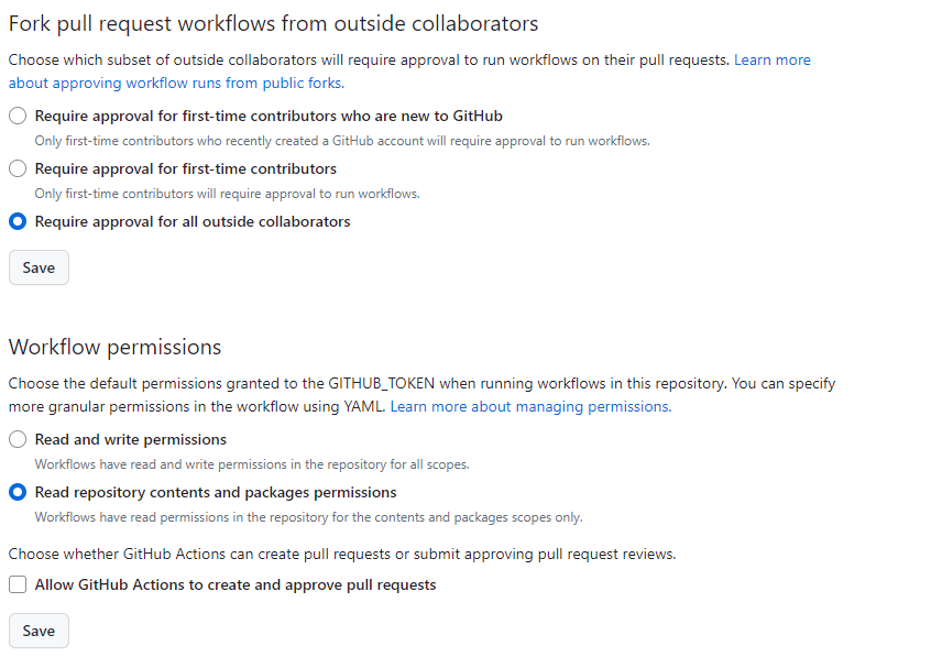 You can further limit what a GitHub Actions workflow can do. Recommended settings: