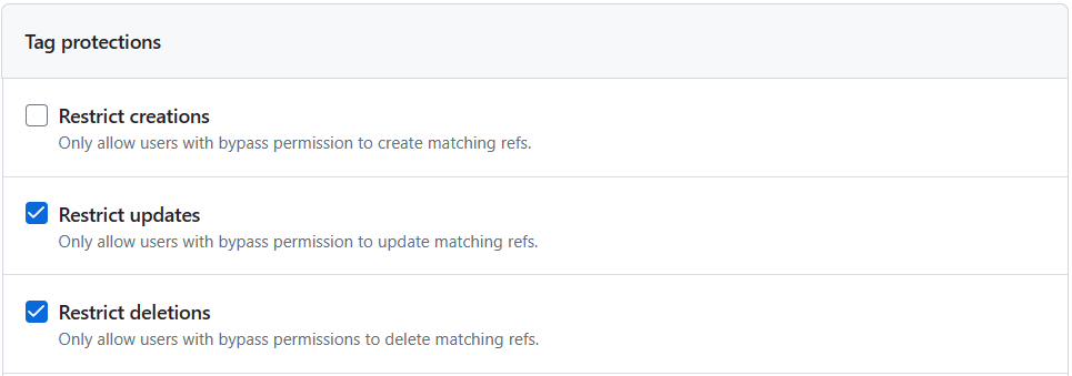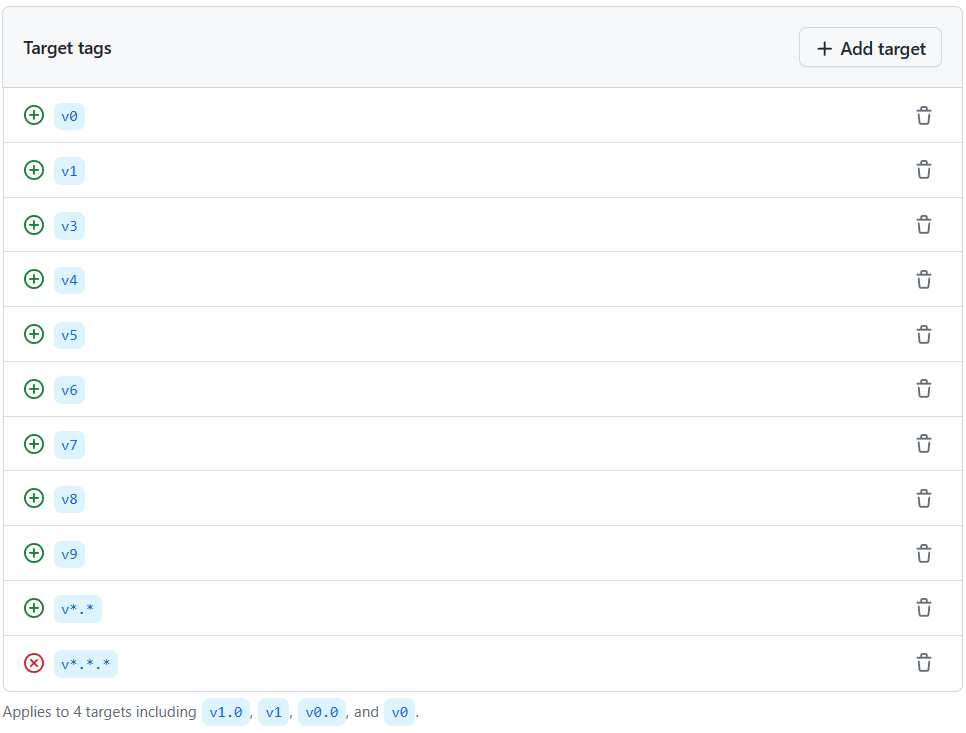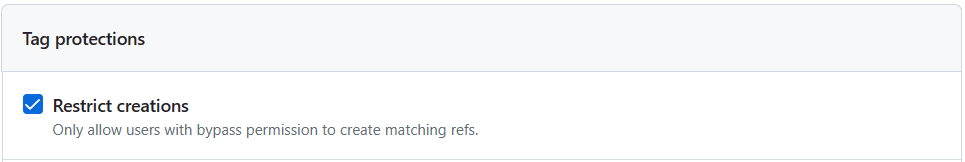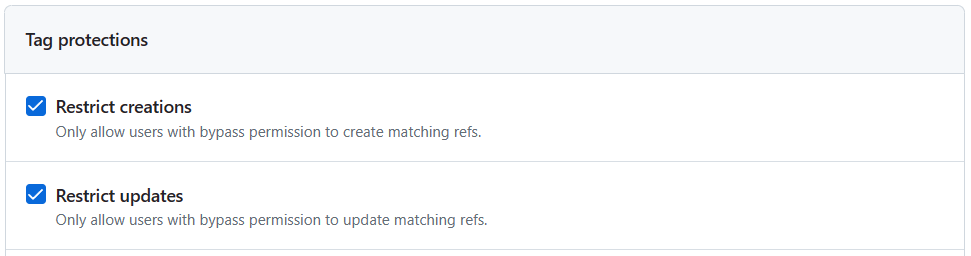 Unfortunately, the tag name format doesn't support regular expressions. To not block the creation of a tag calledverify-sanityor any other tag name that starts with av, I've added the protections for all the ways a version tag can be named in GitHub Actions.