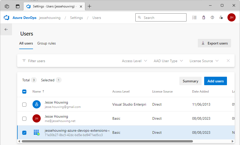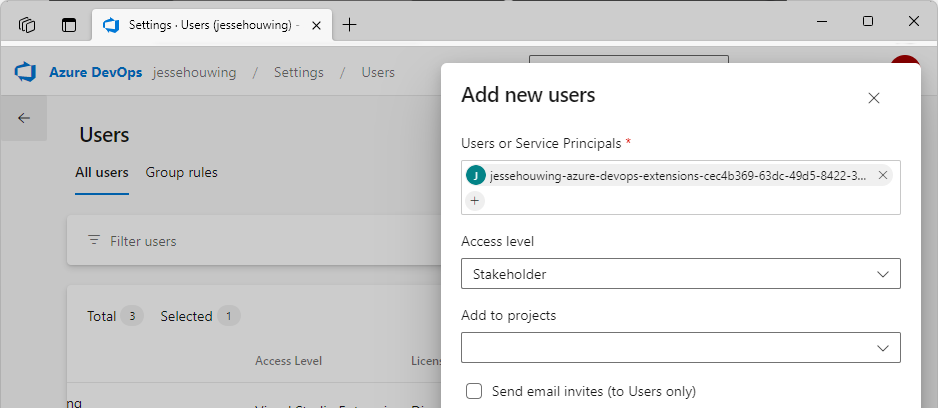 Now go back to Azure DevOps and open the ⚙️ Organization Settings and then Users: