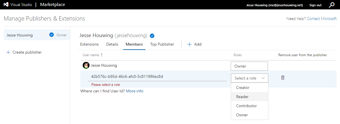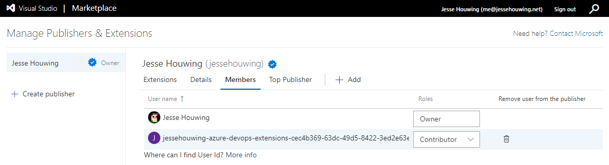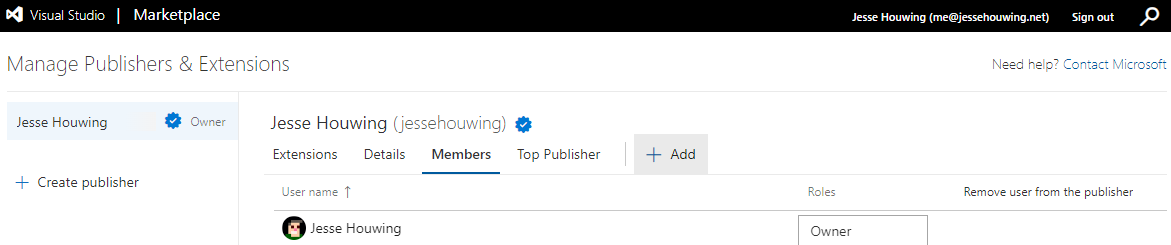 Go to the Azure marketplace and sign in with the owner of your publisher. Click Publish Extensions, then Members: