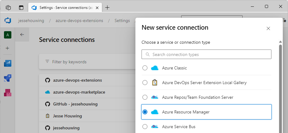 Select your Azure Subscription and a Resource Group and give your service connection a name: