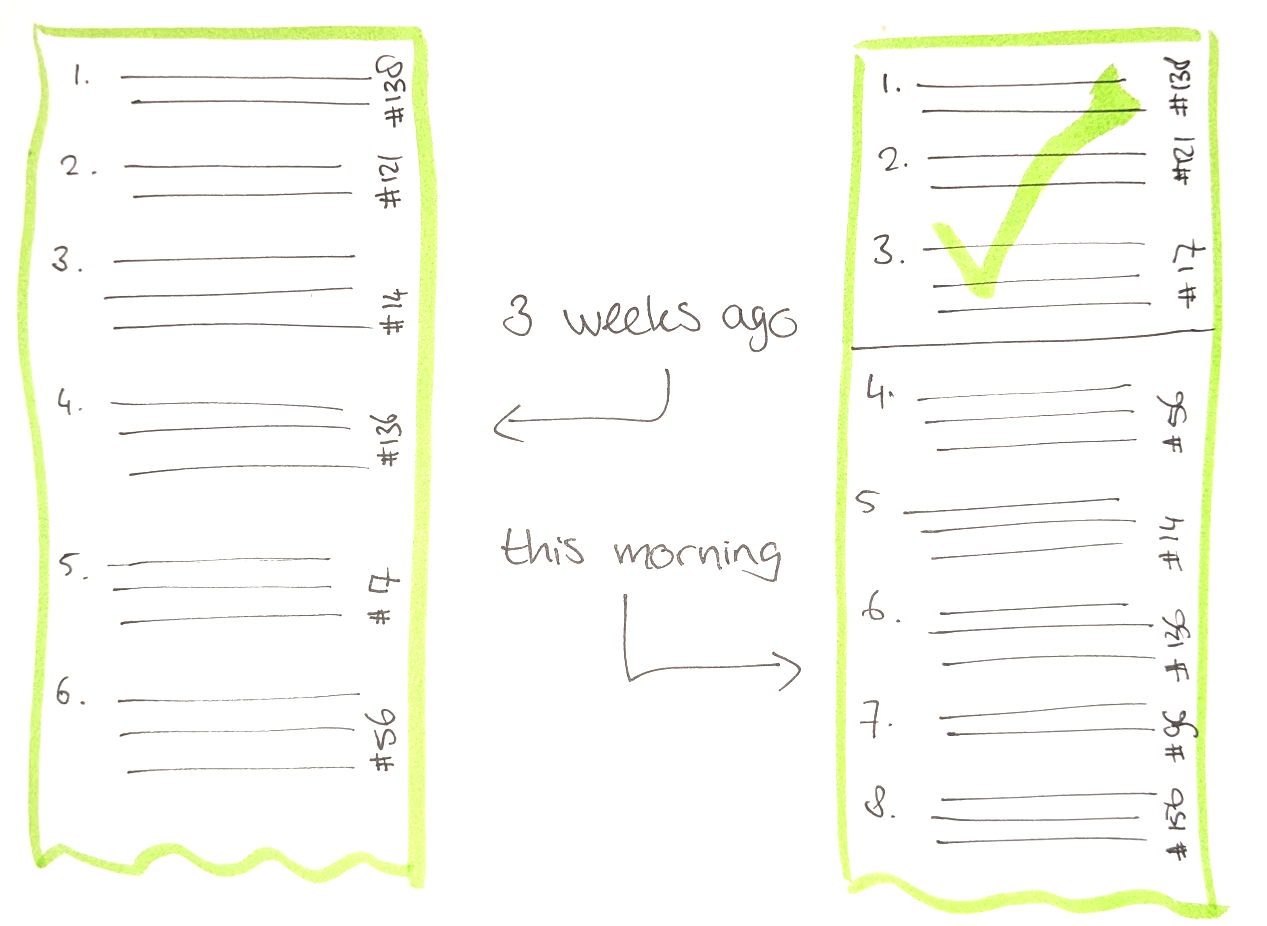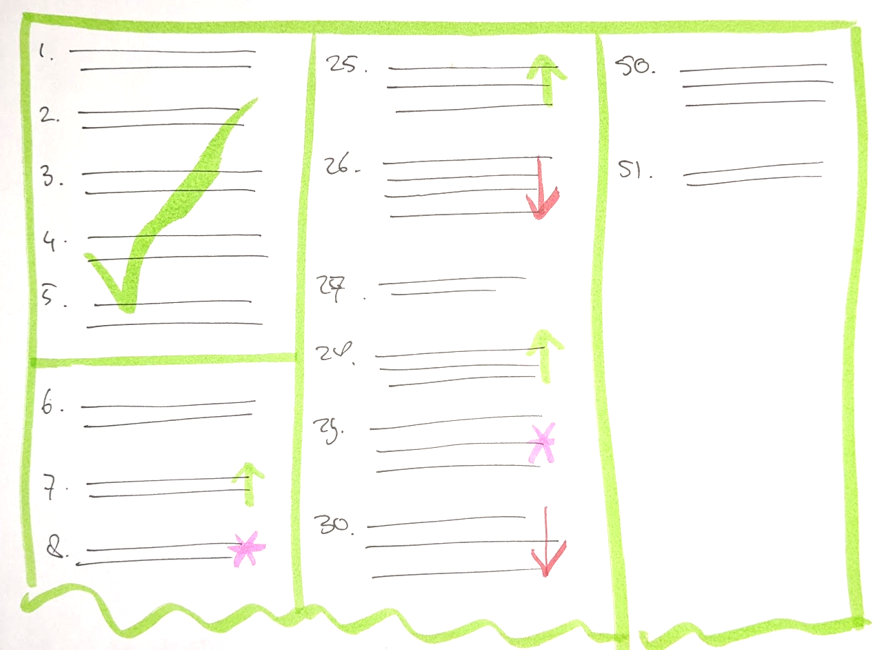 In this option the Product Owner shows the backlog as if they were presenting the Billboard-Top-100. Highlighting the top, the work that was delivered ant will likely be delivered next. The fastest climbers, the items that have increased in potential or priority. The items that have sunk to the bottom. And the starred items, items that need to be highlighted or warrant additional discussion.