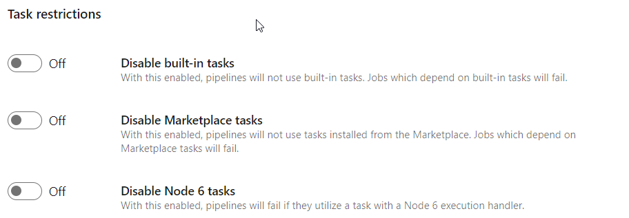 AGENT_USE_NODE10=1variable in your pipeline or environment variable on your agent, you can force the agent to run all Node 6 tasks in the Node 10 handler. Some tasks will break, but you'll gain quite a few Node security features (including the ability to add custom certificates). Alternatively you can now use theAGENT_USE_NODE=lts|upgradevariable to make the agent use a Node version that you have installed on the agent, instead of relying on the version that came with the agent. You may encounter compatibility issues with some tasks. - Consider disabling Node 6 tasks - Recently a change was introduced in Azure Pipelines which allows an administrator to disable Node 6 tasks completely. This will not attempt to use the Node 10 or Node 16 handler, but will simply fail the pipeline.