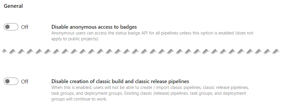 https://dev.azure.com/{{organization}}/_settings/pipelinessettings- Enforce the use of YAML pipelines - As an administrator you can now disable UI based pipelines to ensure all your pipelines are stored in code. This will allow tools like Renovate to service your pipelines.