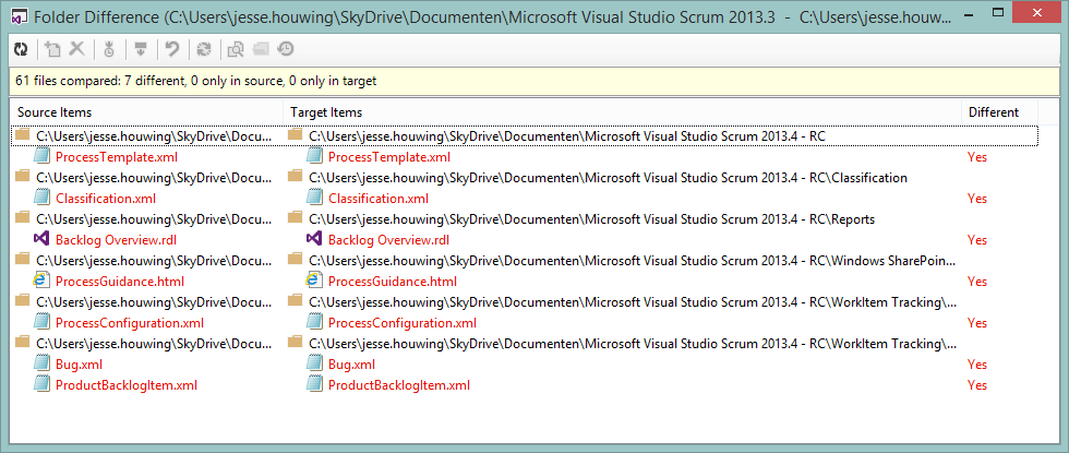 C:\users\Jesse.Houwing\Desktop\Process Templates> tf folderdiff "Microsoft Visual Studio Scrum 2013.3" "Microsoft Visual Studio Scrum 2013.4 - RC" /recursive