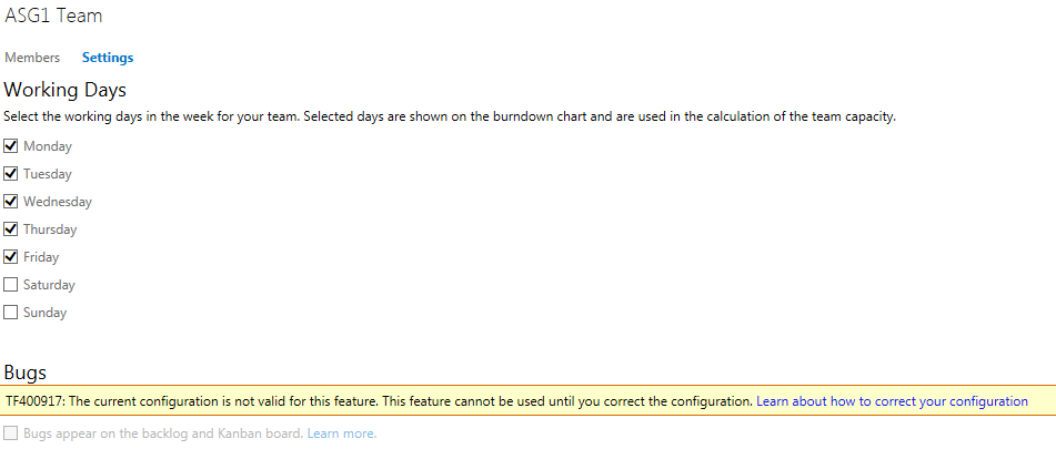 Now when you navigate to the team settings you'll find the option enabled. Unfortunately the default value for this feature is "off", so to put your scrum teams back in order you'll need to go through each and every team to make sure that bugs are configured to show on the backlog.