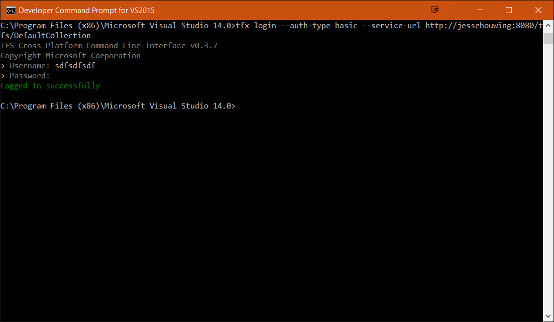 C:>tfx login --auth-type basic --service-url http://jessehouwing:8080/tfs/DefaultCollection