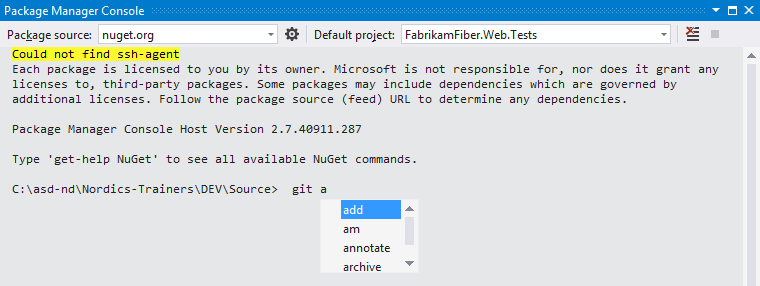 To make your life easier you can even add PoshGit to the Package Manager Console, this will give you command auto-completion. yay!