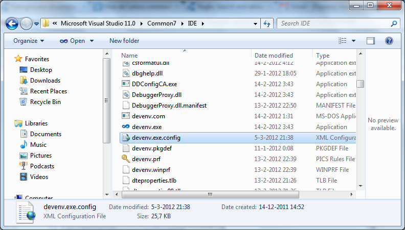 Now open the devenv.exe.config in your visual studio folder using your favorite XML editor (make sure you run the editor as an administrator, otherwise you won't be able to save the file). Also make sure Visual Studio 11 beta isn't running.