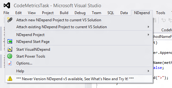 My Visual Studio 2012 is hinting towards the release of NDepend version 5. It's very soon after the release of 4.0, so it kind of surprised me a little. The download link isn't working yet, so no way to confirm...