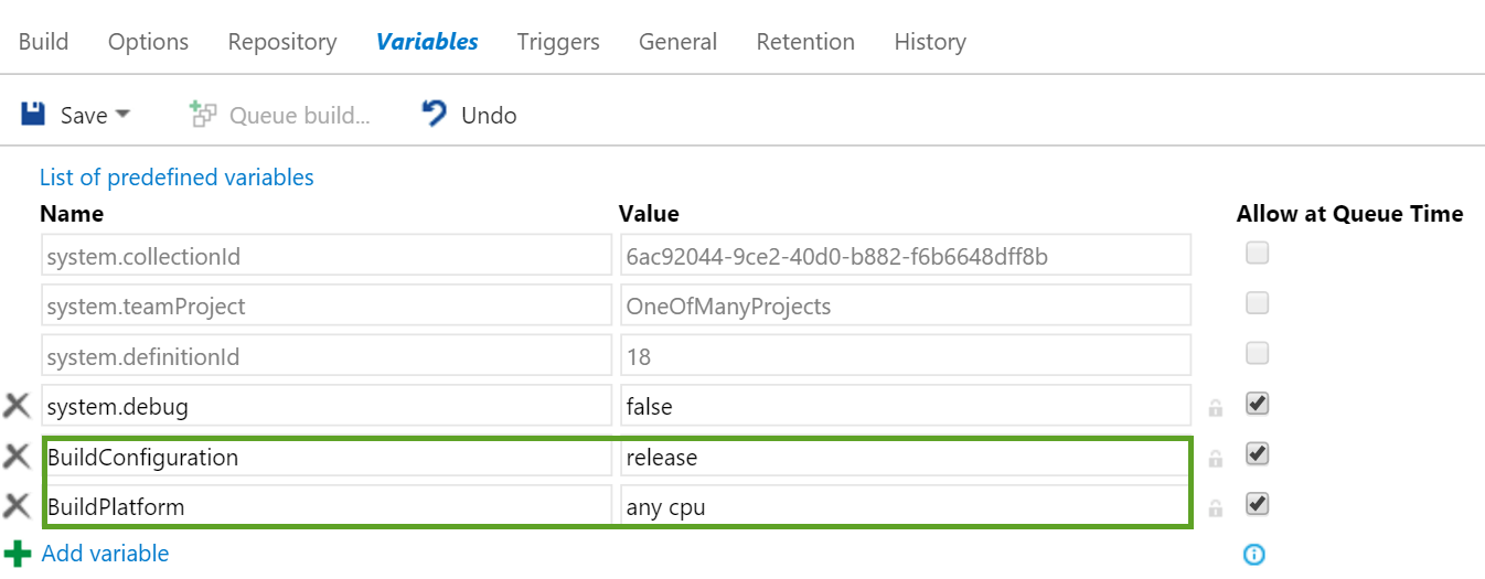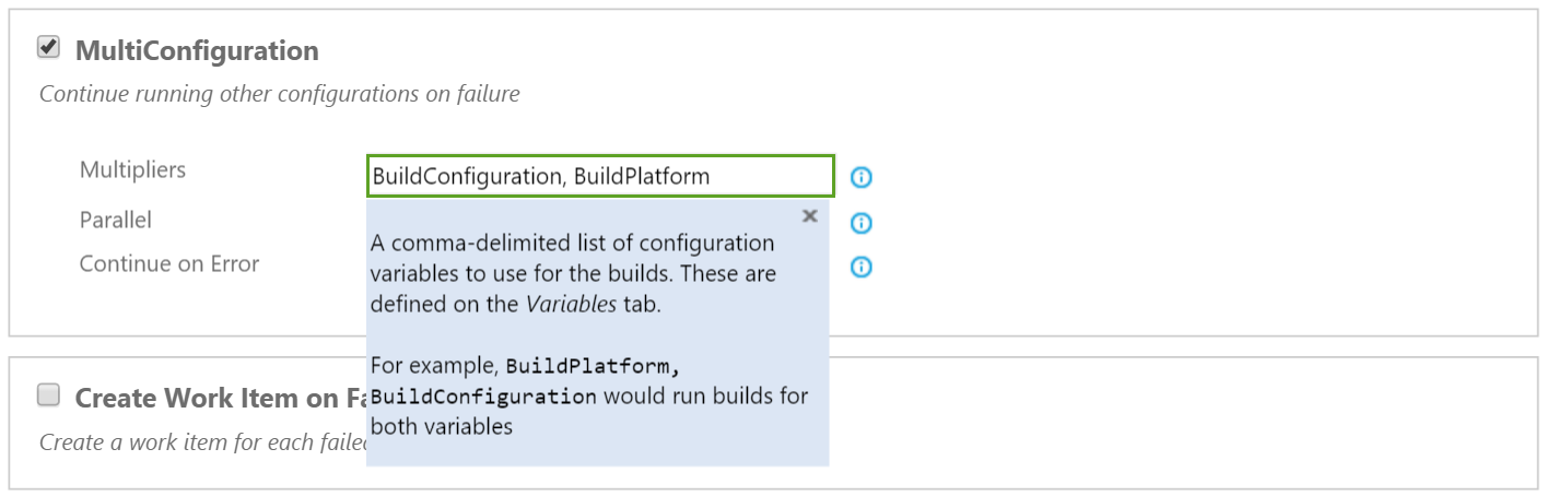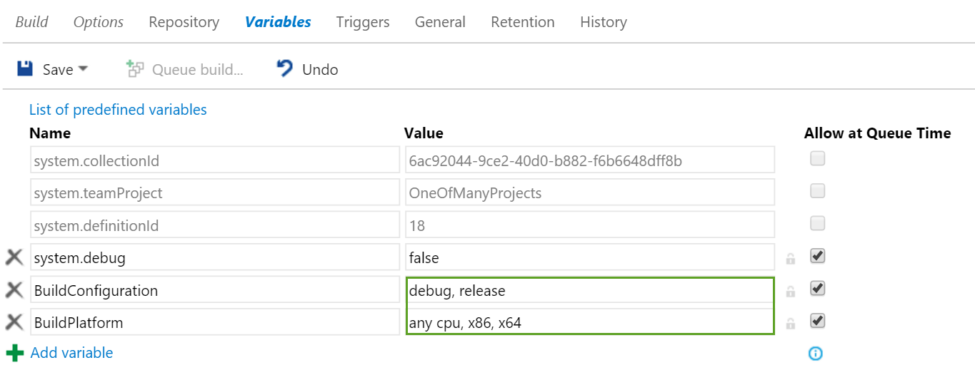 We've enabled the build definition to run a build for each permutation of these two variables. You can add more variables if you like, or only build multiple Configurations or only build multiple platforms by specifying the respective variable. It's not possible to use multiple values without using a variable.