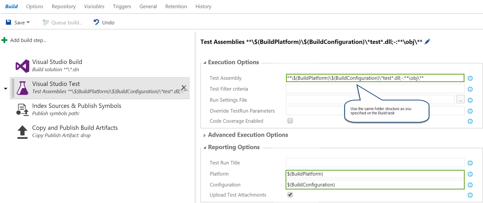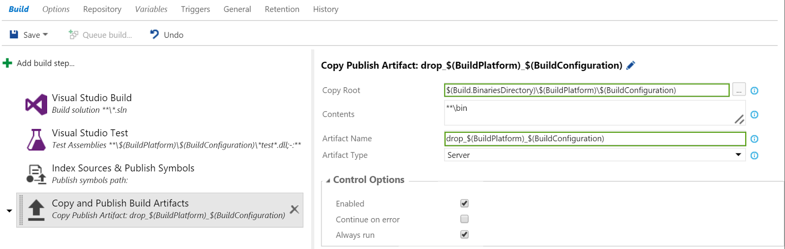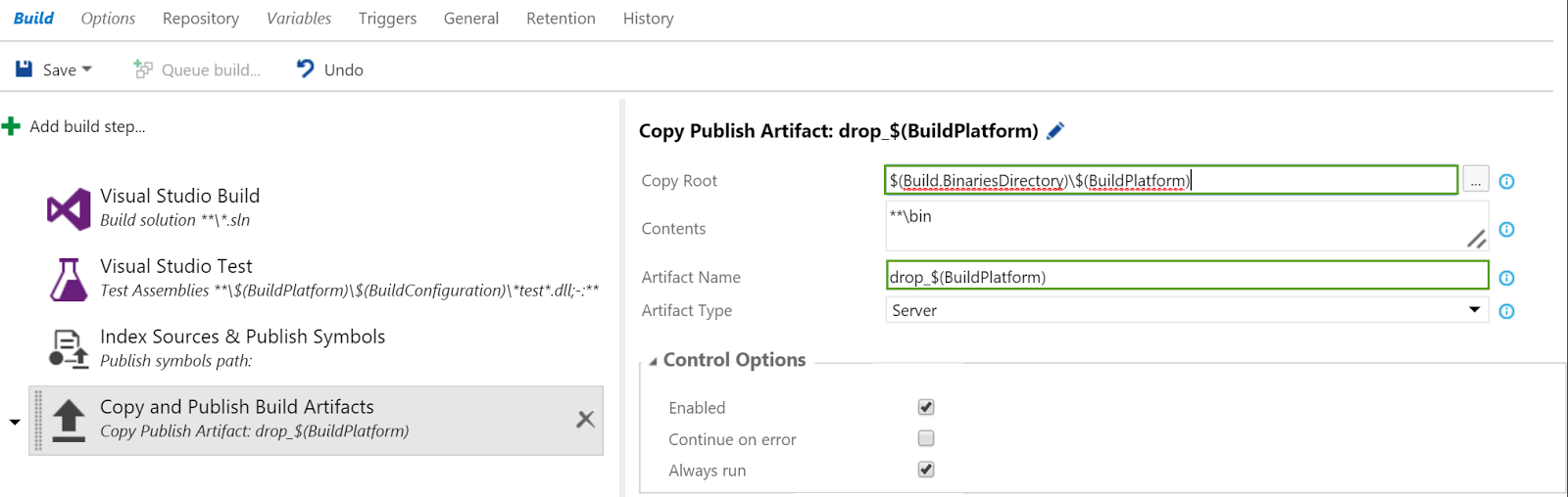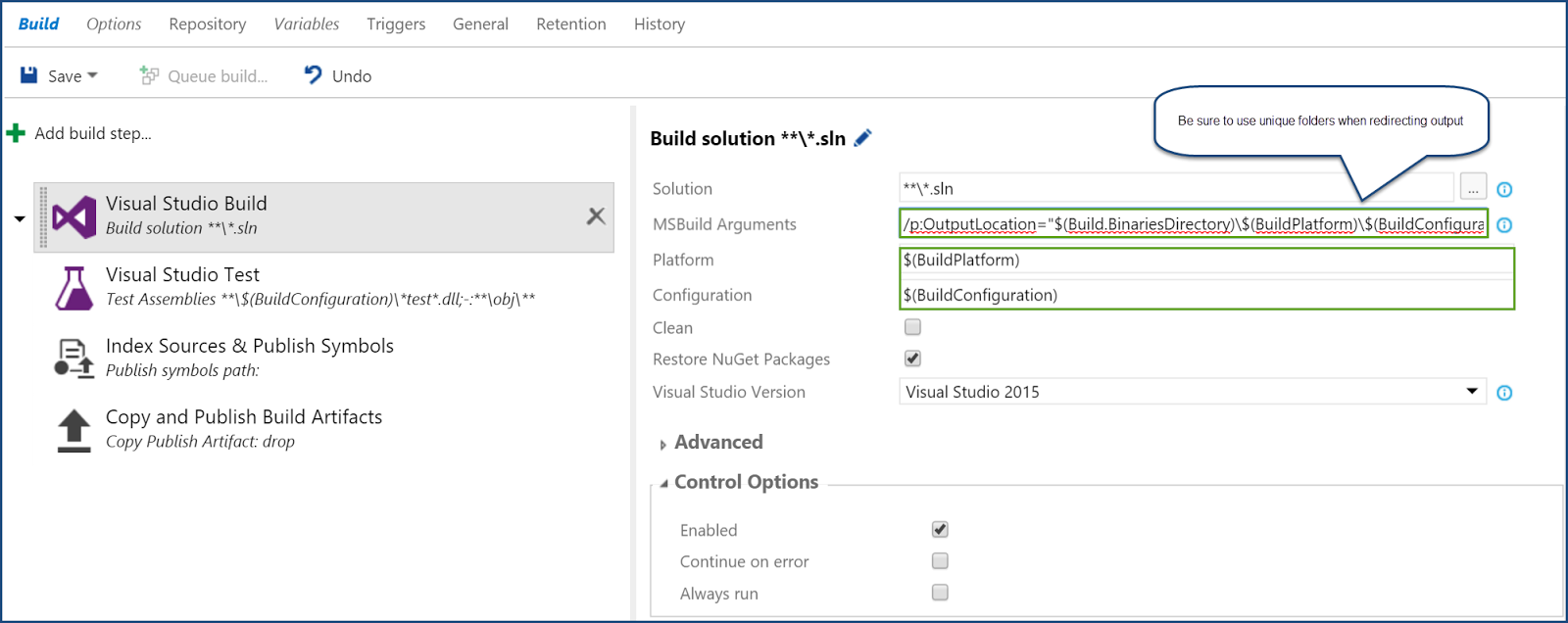 Your next step is to go over all your tasks in your build to ensure that the respective fields are configured. And if you're staging or publishing artifacts, either make sure that your artifacts are uniquely named by including the build configuration and platform, or you'll end up with one massive artifact with all your results.