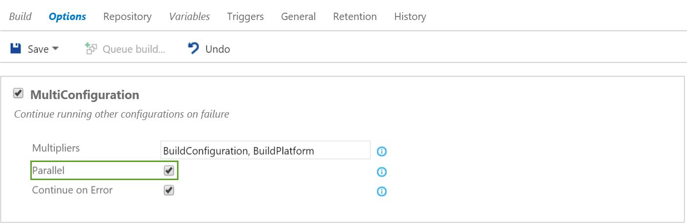 And ow that your build definition successfully builds multiple configurations, you can go ahead and enable parallel builds to reduce the duration/feedback time of your build. You specify this as additional option on the Options page: