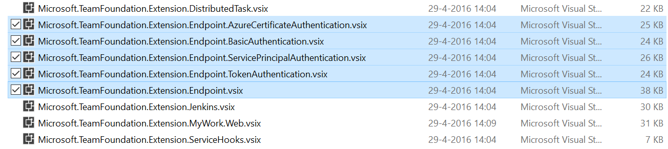 C:\Program Files\Microsoft Team Foundation Server 14.0\Tools\Deploy\TfsServicingFiles\Extensionsto find the standard extensions that define the basic behavior of a standard installation. In there you'll find 4 vsix files: