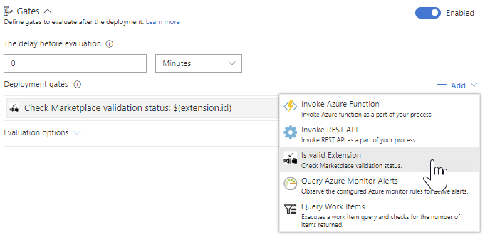 - The Is Valid Extension task which runs on the Server - This version requires you to link a Release Pipeline to your build and to configure release gates. It runs on the server and doesn't consume build minutes nor a concurrent pipeline. You may not have access to all the variable in the server context to run this task. When validation fails the task will not fail until the timeout expires.