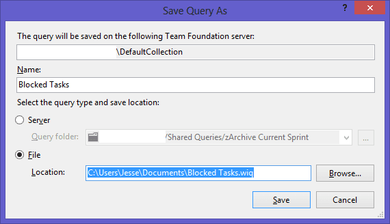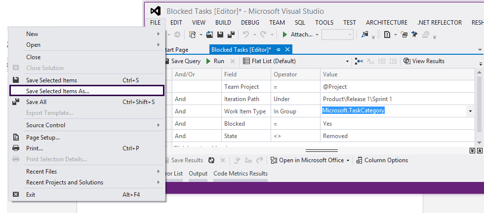 So if you're ever having to write a Work Item Query for the API, use the following trick to make your life easier. Create a new query inside Visual Studio or edit an existing one. Use the File->Save Selected Item As...
