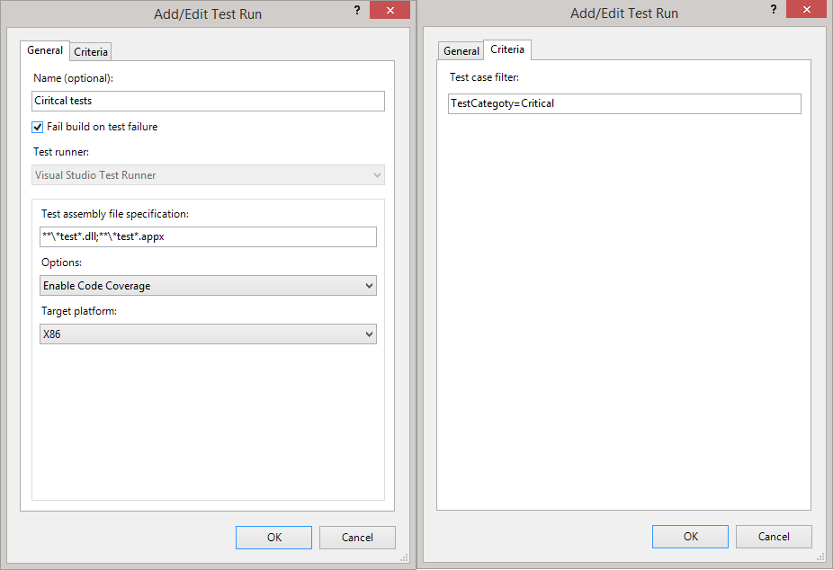 Once you've categorized your tests create the test runs in Team Build. Each stage or set of tests will map to its own test run. In this example we're going to distinguish critical tests from non-critical tests using a simple attribute.