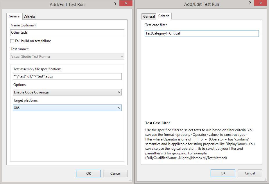 - Test Case Filter: In this example we're going to use the TestCategory attribute to distinguish the non-critical tests. For now, you'll need to accept the filter we're adding here